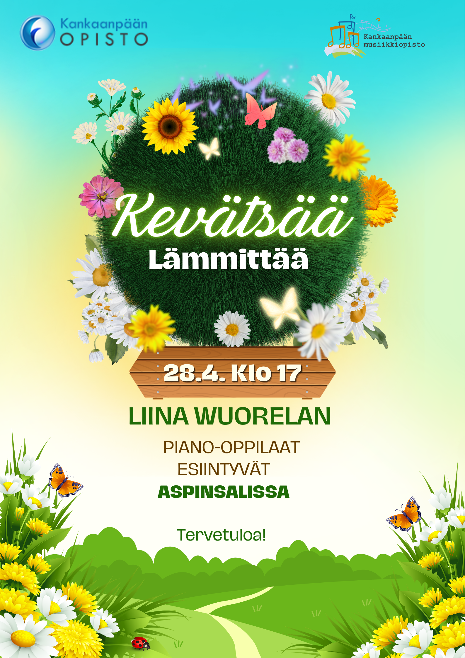 Kevätsää lämmittää -konsertti tiistaina 28.4.2026 klo 17.00. Liina Wuorelan piano-oppilaat esiintyvät Aspinsalissa.