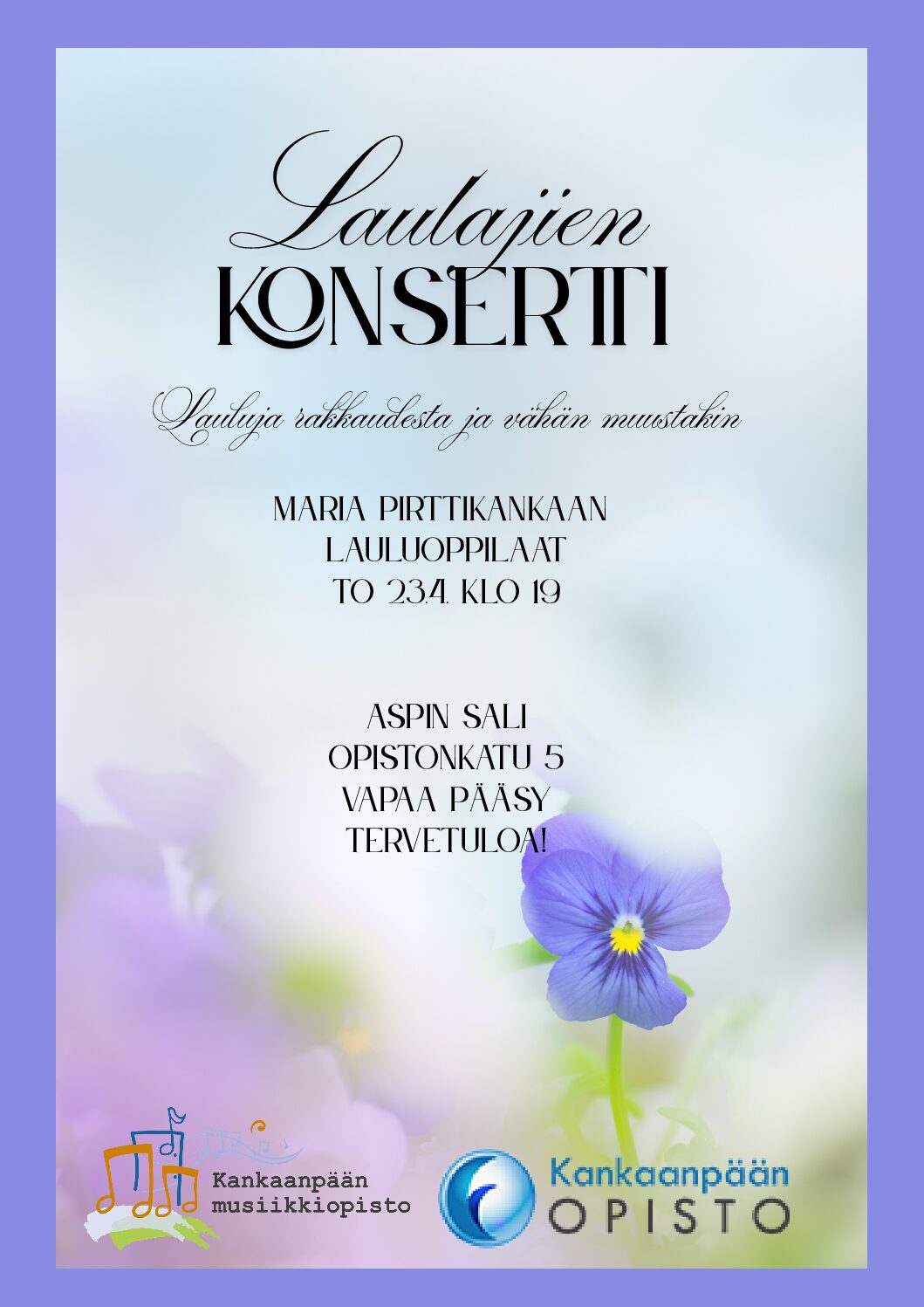 Lauluja rakkaudesta ja vähän muustakin – Maria Pirttikankaan lauluoppilaat esiintyvät to 23.4.2026 klo 19.00 Aspinsalissa.